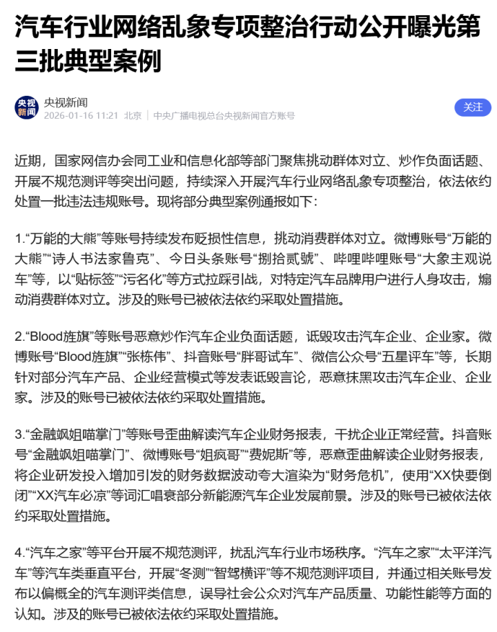 1月16日,据央视新闻消息,近期武汉世牛,国家网信办会同工业和信息化部等部门聚焦挑动群体对立、炒作负面话题、开展不规范测评等突出问题,持续深入开展汽车行业网络乱象专项整治,依法依约处置一批违法违规账号。现将部分典型案例通报如下:
